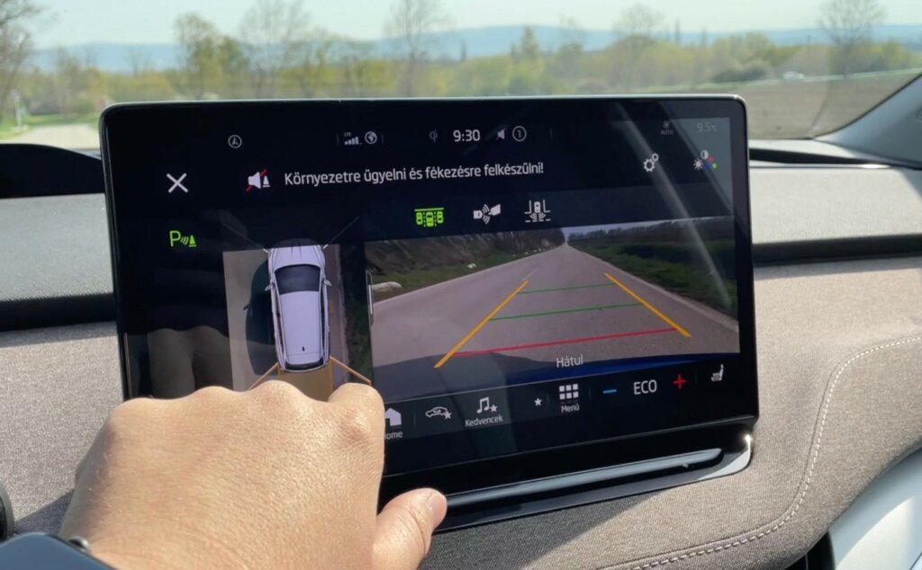 Sok a tárolási lehetőség, bőséges a helykínálat, a lebegő konzolra pedig még egy menetválasztó csúcska is odafért, praktikus, könnyedén kezelhető, így villámgyorsan előre vagy hátramenetbe kapcsolhatunk. Extraként akad 360 fokos kamerarendszer is nagyon jó képminőséggel, könnyű így beparkolni még szűk helyekre is. Ne felejtsük el azt sem, hogy a hatalmas képernyő alatt fizikai gombokat is találunk, a legfőbb funkciókat tehát odanézés nélkül is elérhetjük, nagy öröm ez manapság.