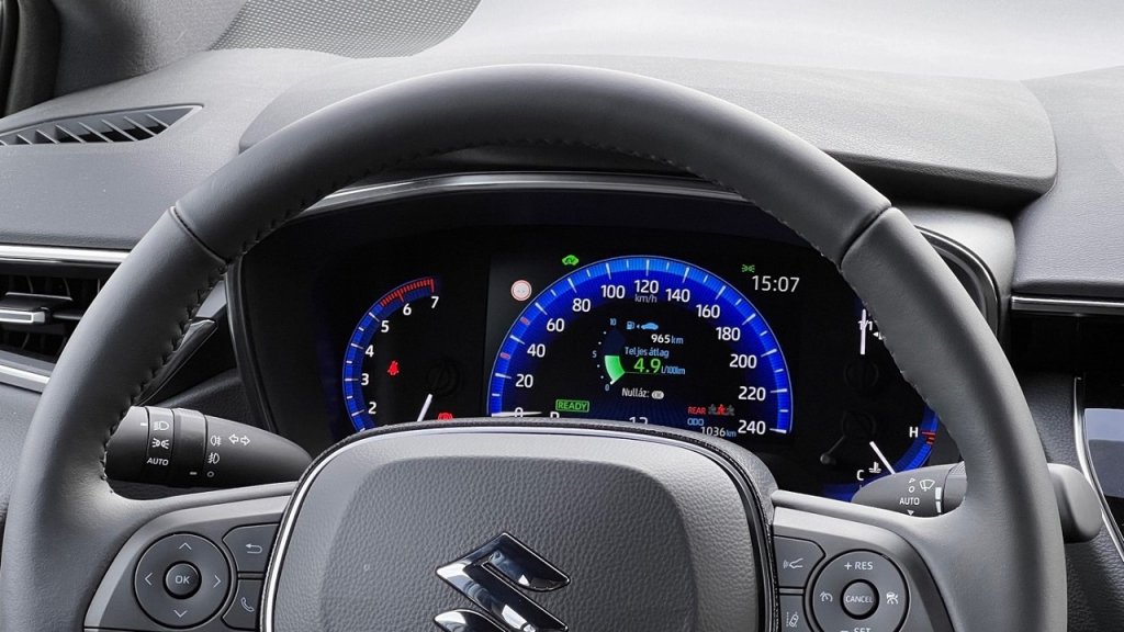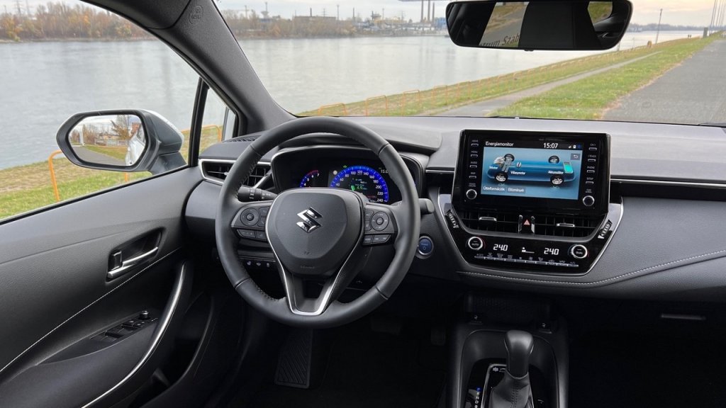 A hajtáslánc is koppra megegyezik a Toyotánál látottakkal, ami azért valljuk be, remek hír, hiszen egy több évtizede fejlesztett és már igencsak kiforrott rendszerről van szó. Az egyik alappillér az Atkinson ciklusú, 1.8-as benzinmotor, ami 98 lóerős teljesítménnyel járul hozzá a sikerhez, a rendszer részét pedig még egy 72 lőerős és 163 newtonméretes villanymotor plusz egy generátorként és indítómotorként is szolgáló elektromos motor képezi. Az összteljesítmény 122 lóerő, ez pedig bőven elég ahhoz, hogy dinamikus mozgásra késztesse a kasztnit, kicsivel több mint 11 másodperc alatt lehet álló helyzetből elérni a 100 km/h-t. Van ugyan váltókar bent, méghozzá visszatöltést generáló B fokozattal, ám ezt csak a megszokás miatt lehet váltónak nevezni, mert hiába e-CVT, ez egy elektronikusan vezérelt, fokozatmentes erőátvitel. Éppen ezért aki először ül ilyen hibridben, annak pár dolgot azért meg kell szoknia. Egyrészt, hogy a benzinmotor beindítása nélkül is képes teljes csendben megmozdulni az autó, másrészt viszont olyan is előfordul, hogy menet közben a semmiből úgy felpörög az erőforrás, hogy a sofőr csak pislog, mi ez a zakatoló magas hang. Hát igen, a benzinmotor az aprócska akkumulátort is tölti, plusz a hajtásba is besegít, a működése pedig nem csak a gázadás mértékétől függ, hanem hogy a rendszer miként ítéli meg a bekapcsolás szükségességét. De ha megszokjuk ezt, a Suzuki Swace máris méltó társ lesz a mindennapi közlekedésben.