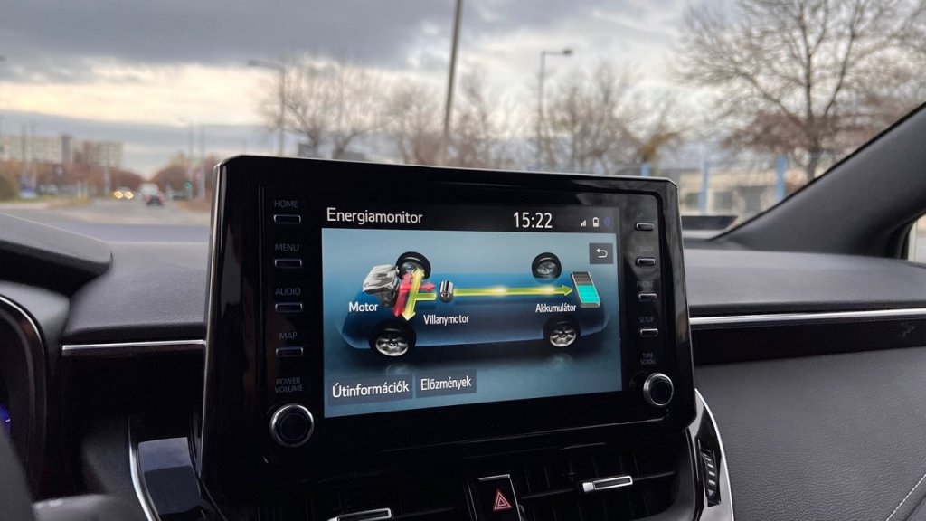 A szélzaj is csak akkor emelkedik meg egy kicsit, ha már autópályán utazunk, a tükrök és a hátsó ablakok felől lehet hallani, de üvöltve beszélni még ilyen tempónál sem kell. A multikormány kényelmes fogással segíti a hosszú távú utazást, vezérelhető róla a tempomat és a zene is. Mögötte látható analóg formában a fordulatszám, az üzemanyagszint és a vízhőfok mérője, digitális verzióban pedig a sebesség, a fogyasztás, a hatótáv és a megtett kilométer figyelhető meg. A képernyő alapesetben kék csíkkal jelzi a sebességhez tartozó egységeket, de amikor sport módba kapcsolunk, akkor morcosabb, piros árnyalatba öltözik a panel. Középen van még egy nagyobb kijelzőnk, ahol egyrészt láthatjuk a hibrid rendszer működését, másrészt pedig vezetékesen elérjük az Android Auto és Apple Carplay szolgáltatásokat, mondjuk az USB csatlakozó elég béna helyre került, a középkonzol éppen hátrafelé futó része alá. Örülhet a sofőr, hogy az érintésérzékenység mellett a fő funkciókat fizikai gombok segítségével is el lehet érni, ráadásul ugyanez igaz a klímavezérlő panelre is, lehet tekergetni a kétzónás klímát. A beltér tágas, az ülések egész kényelmesek, ezen a felszereltségi szinten pedig ülésfűtés is jár, amit két fokozatban (plusz a kikapcsolás) lehet állítani.